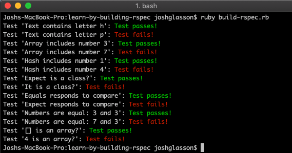 I also installed the colorize gem so I could add colour to my outputs. Passing tests are green, and failing tests are red.