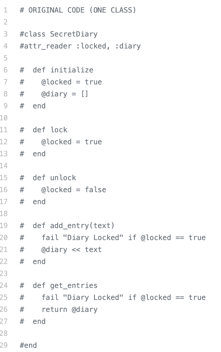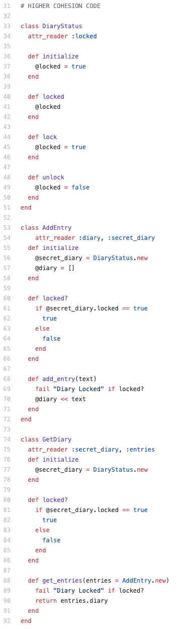 I started with Encapsulation. The first few exercises in the practical were fairly straightforward, I just had to look at methods in a class and group together ones that were similar. Then I had to look at which ones could potentially be moved to a new class. The fourth and final exercise was where it got a little tougher. Using TDD, I had to take some pre-written code and make it totally cohesive, by splitting it into separate classes. It took me a little while to get everything to work together as it should but I did get there eventually! Here is the original code:
