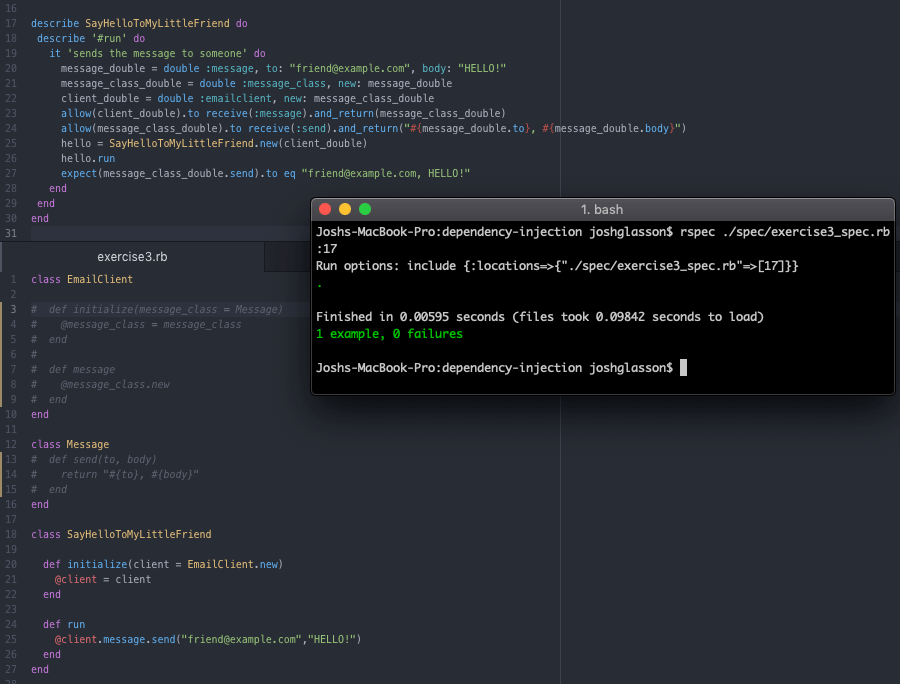 Here is my finished repo for the practical. To be honest I found it quite difficult, and I wouldn’t say I am overly confident on it now, but I did manage to complete it on my own with no help from coaches or google, which I am happy about. Basically it was about writing code that depends on variables or methods injected from other classes, and then writing tests for that code, where it is unaffected by changes to the classes. So you have to use Doubles to set variables to ensure that only the class in question is really being tested. The idea is that if a class breaks, it shouldn’t break all the tests for other classes that rely on it. Those classes have their own tests to make sure they work, they should be able to assume the class they rely on will work every time. Adding doubles into tests means that even if you were to delete everything in that class, your tests would still work! See below an example: