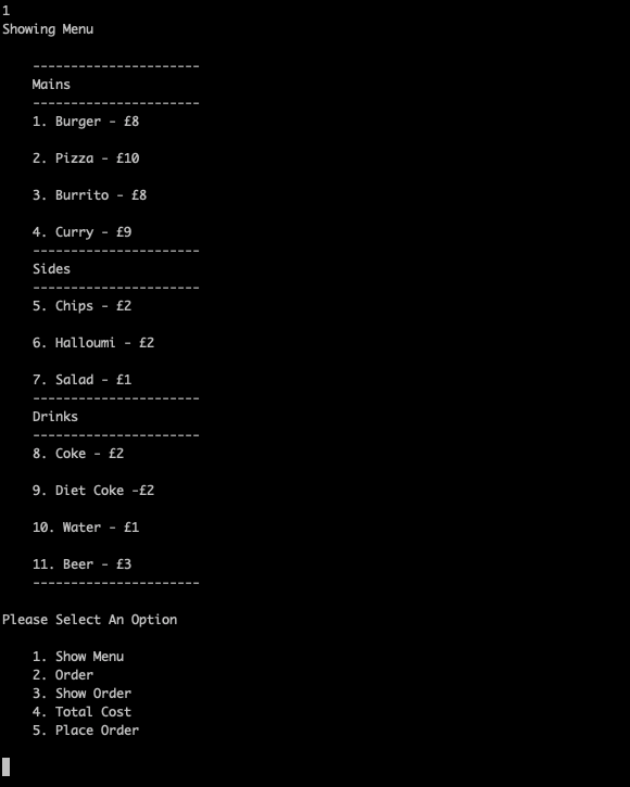 Today we undertook the Takeaway Challenge. Unfortunately it is much less delicious than it sounds, it involves no actual eating of takeaways! We had to build a takeaway application which could show a menu, take orders, show the costs and place an order. We were given relatively little direction on how to do this, so I went with a similar method to the student directory from a couple of weeks ago. I thought it might be easier to show it working rather than talk through it!