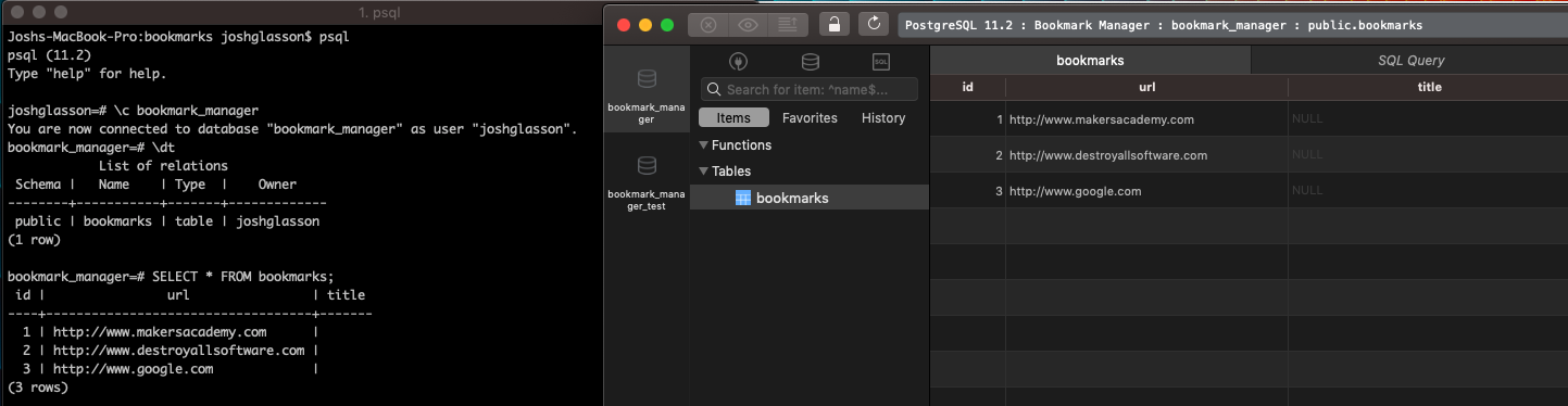In the afternoon we started the Bookmark Manager challenge. We have to create a Bookmark Manager website where you can store your favourite websites as bookmarks. These will then be stored in a database. Mostly for this we are following a walkthrough as it is completely new to us. There are some bits which are the same as last week but it is generally new. As part of this we have downloaded some software called TablePlus which gives you a clear view of your database tables. It is much easier than the alternative of running psql in terminal and having to navigate it that way. Here is a comparison: