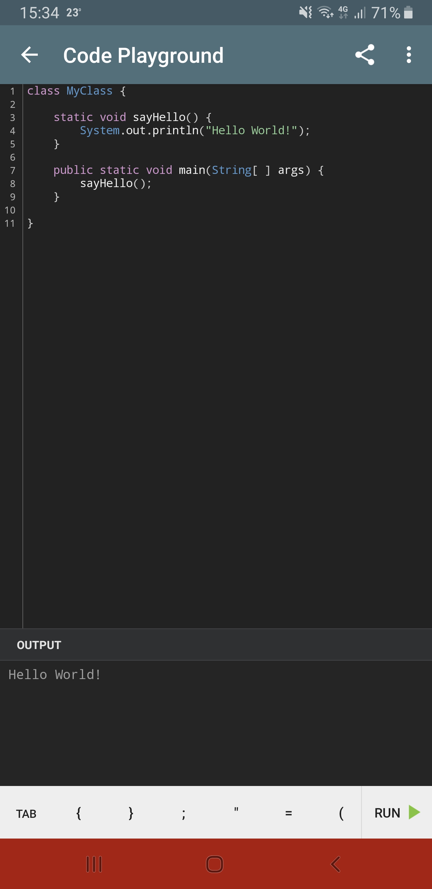 I downloaded an app called SoloLearn on my phone, which has tutorials on loads of languages. I started from the very beginning with Java, and got to the point of looking at classes and methods. The good thing about the app is it gives you a coding environment to actually play with your code, as below: