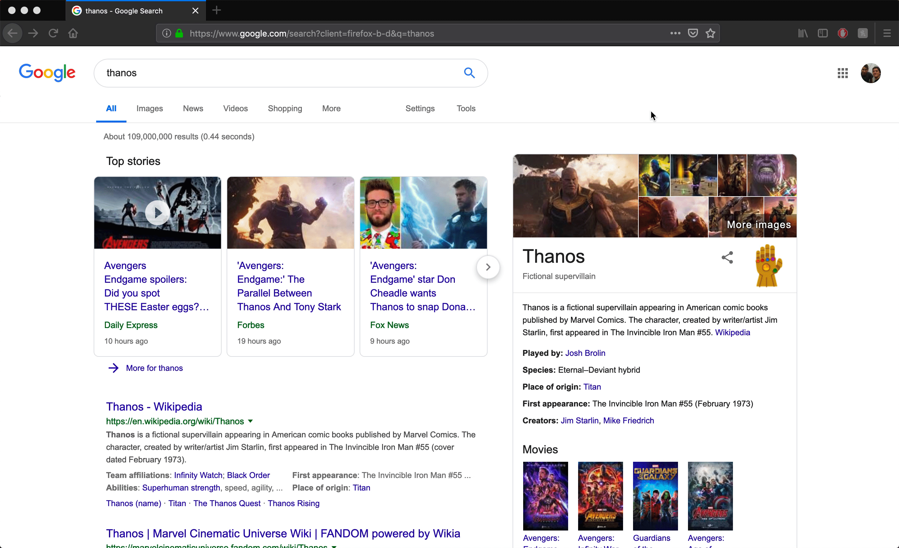 In Google at the moment, theres a cool easter egg. If you type Thanos in to your search bar, then click the gauntlet, he will snap away half the results! Here is a reddit post about how it works.