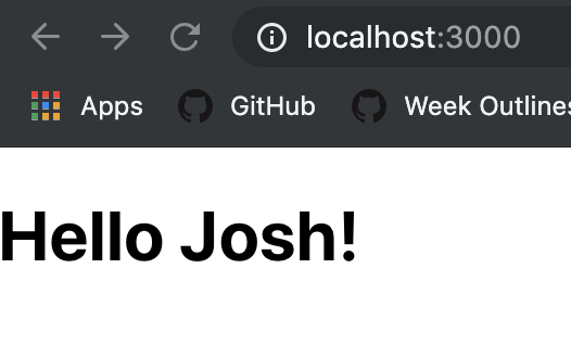 We can also add custom properties, defined with props. In our Hello class, we change “World” to be {this.props.name}. Putting it inside the curly brackets tells it to run JS. this.props.name defines a property on the class called name. We can then change our React app to render <Hello name="Josh" /> to give us this: