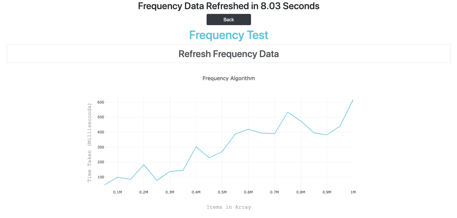 It is now O(n), although it still takes longer to run than the others, but with 1million numbers in the array it’s not surprising. Originally I was sorting the array before running the frequency code, however with this method that actually isn’t necessary. Removing that took about 3 seconds off of the total run time of the method (although it was outside of the time plotted on the graph so didn’t effect that).