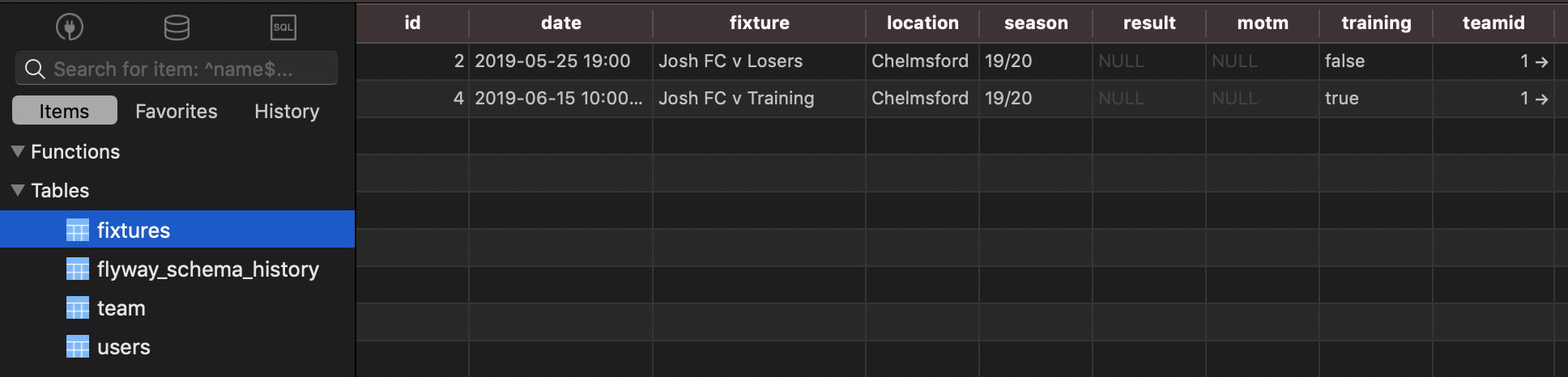 This code is basically checking the status of our training flag (which is changed by the checkbox) and either setting the away team based on the form, or changing it to say training. You can see this in the database below. The fixture name is different for the line with the training flag set to true.