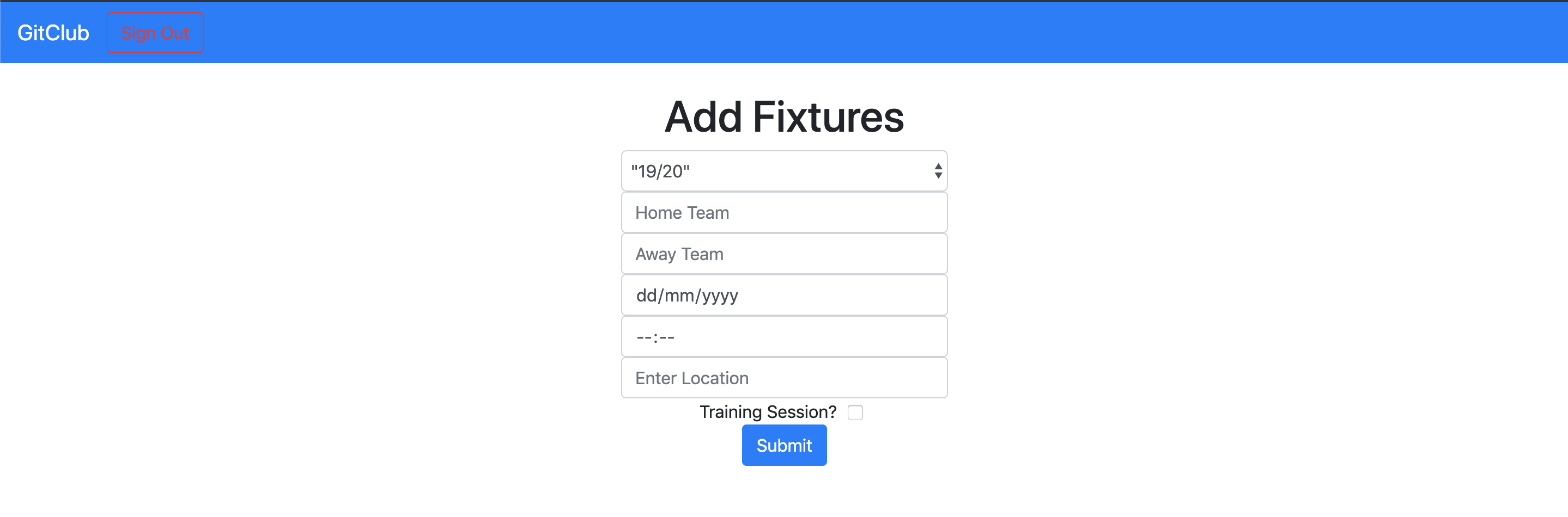 Our next feature was the ability to view upcoming fixtures and training sessions on the landing page. For this to happen we first need to add the ability to add fixtures. We started by planning out all the data we would need to be linked to fixtures; date, time, location and teams. We also added in the team id so fixtures could be linked to a certain team. We also added a tick box so training sessions could be added instead of actual fixtures.