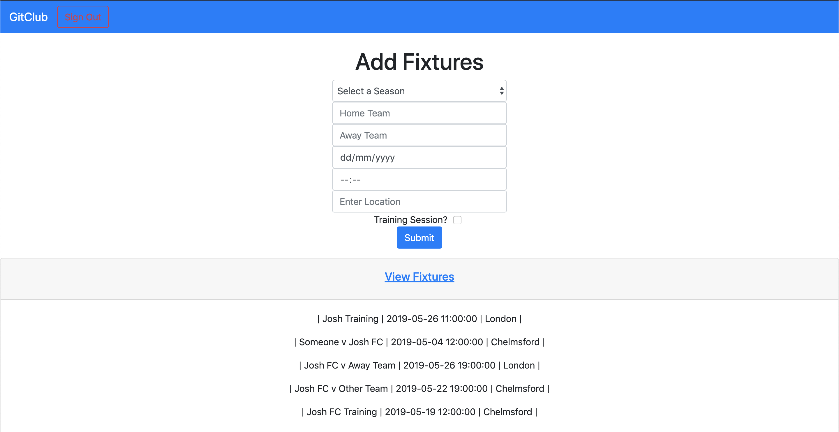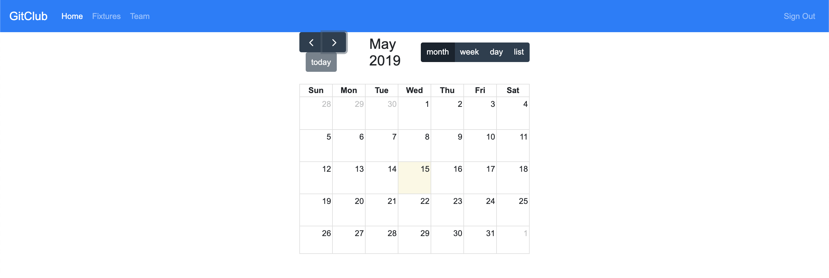 One of the features we really wanted is to display all the fixtures and training sessions in an interactive calendar. We were hoping this would be fairly straightforward, but as is usually the case it really is not! I did a lot of Googling to find a solution, and the best I have found so far is https://fullcalendar.io/. I have managed to get this to render a calendar in our app.
