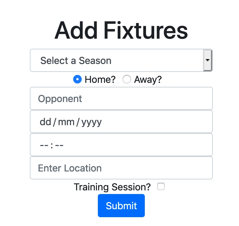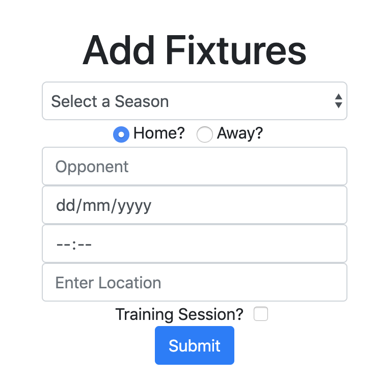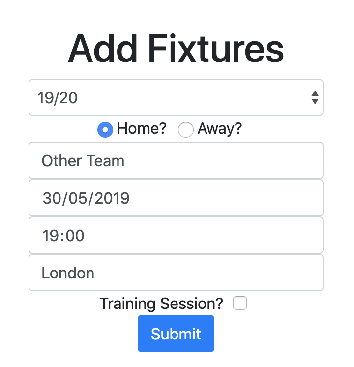 I mentioned yesterday that I wanted to look at further improving the usability of our add fixture form. I added the home/away checkbox I mentioned yesterday, and changed the two textfields to one for the name of the opponent. Depending on which option is selected, the opposition is put first or second. I also updated it to automatically fill in the name of the team signed in.