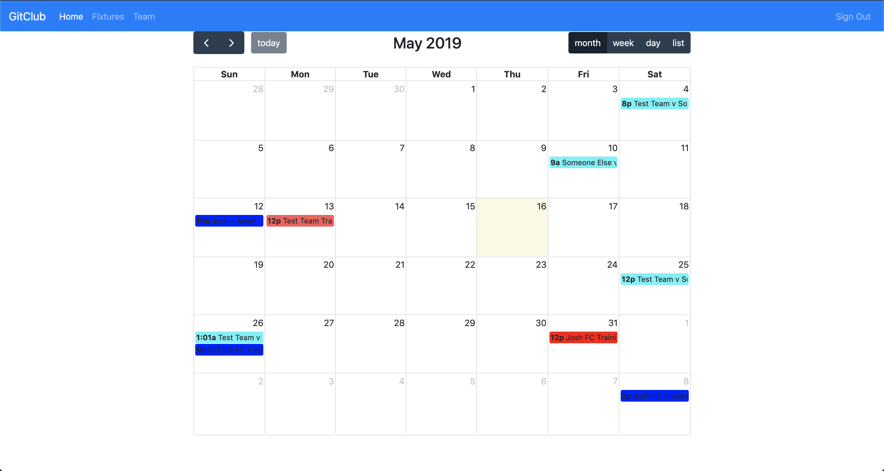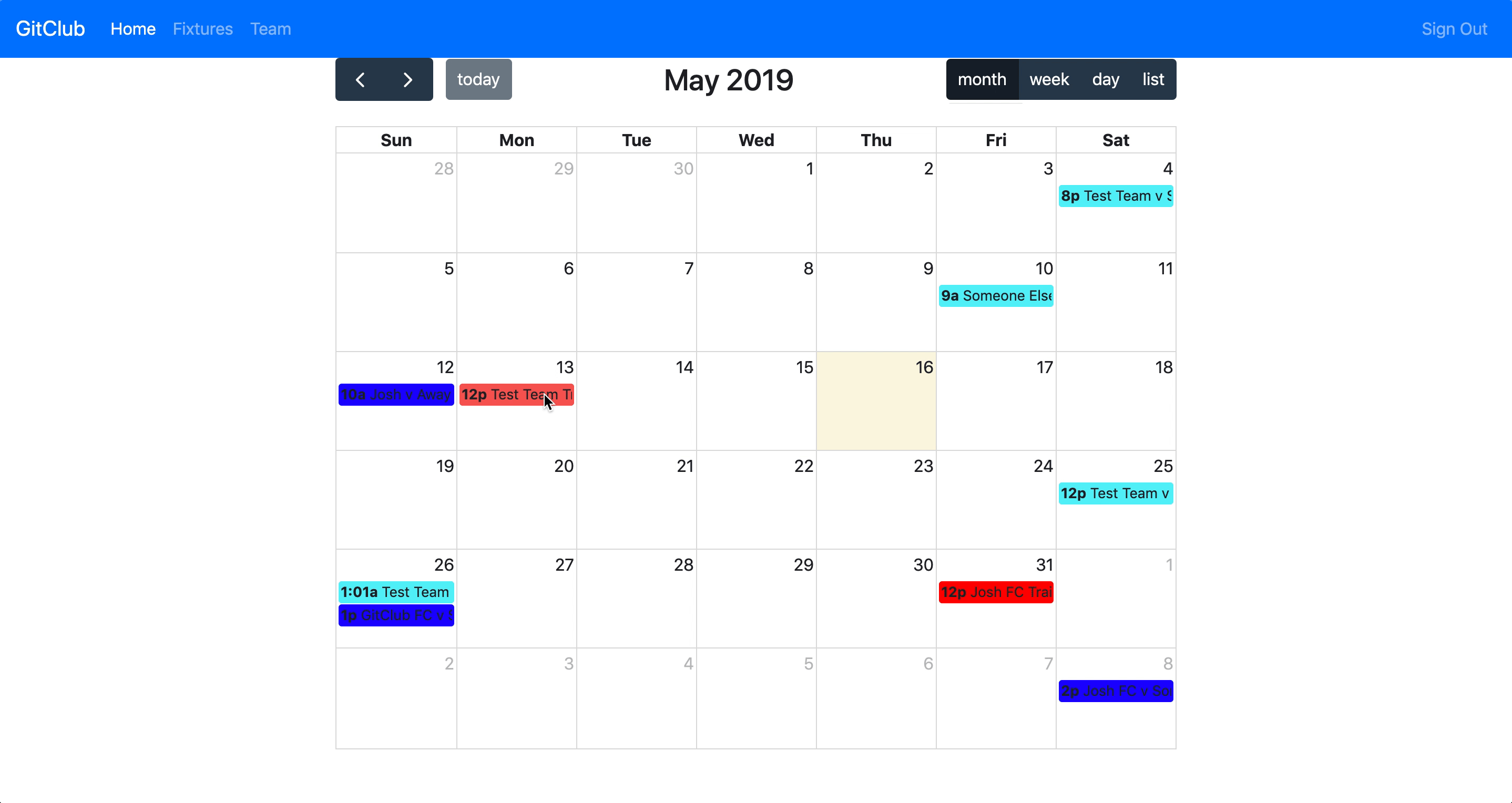 I carried on work with the Calendar last night and all of this morning, and still it eluded me, however I knew I was getting closer and closer! I had the calendar rendering yesterday, and this morning I got it to show data. Then I got it to show data that was the same format as data coming back from our database. After that I created a new database table to only store the information I needed from our fixtures, with the correct column titles. I added this into our addFixture page too so that whenever a fixture was added, it gets added to both databases.