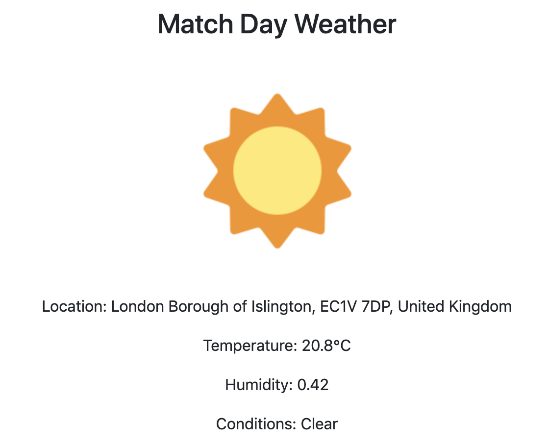 Now it worked! The only problem with this was it relied on the weather api returning location correctly, and also was not specific, it could really only find locations such as ‘London’ rather than a specific address.
