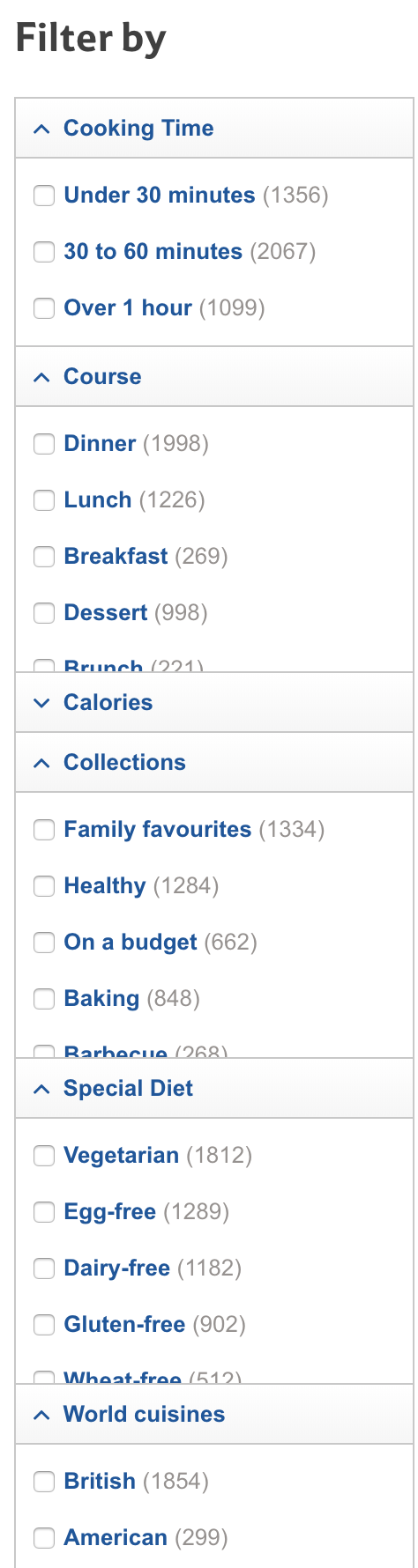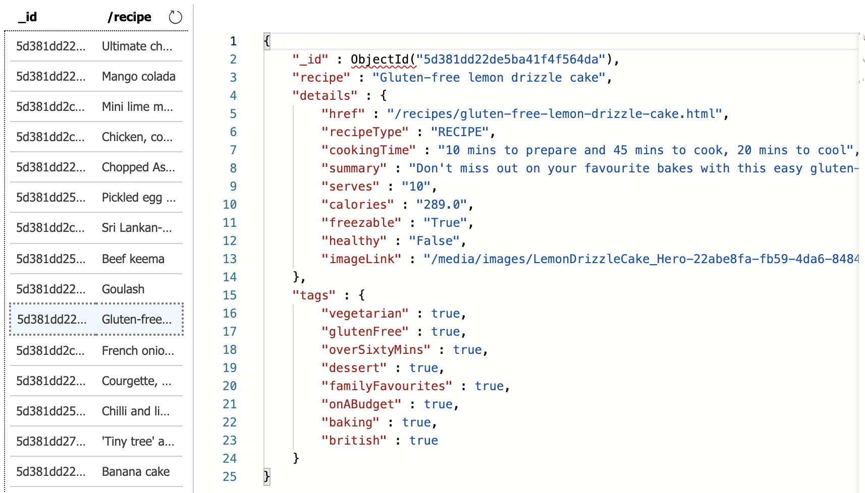 We saved it into an Azure Cosmos Mongo Document Database, as our application was deployed on Azure. I then added an index so the database would be searchable. By using the JS scraper, I was able to select specific tags while scraping, which is how I got allergy information. By ticking a box on the website, I knew the displayed results would sit in that category, so I added that category to the document for each recipe displayed. Below is the list of options available on the website, along with how that translated into the database. If a recipe didn’t appear on the page when an option was ticked, that tag simply doesn’t appear for it on the database.