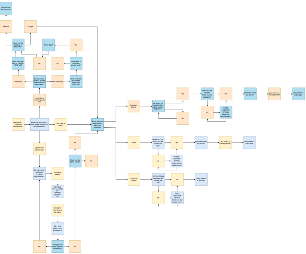 During the first two weeks we developed the idea we wanted to work on. Our idea was the Tesco Meal Planner, a voice controlled assistant which would help you plan meals, using data from the Tesco Real Food website. This is the final flow of conversation for the project. The text isn’t really readable, but it shows the amount of options we added in.