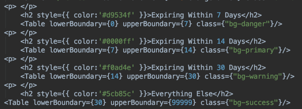 Using React I created a front end that would then display the information from the database, sorted by date, with different tables showing different groupings of time until expiry.