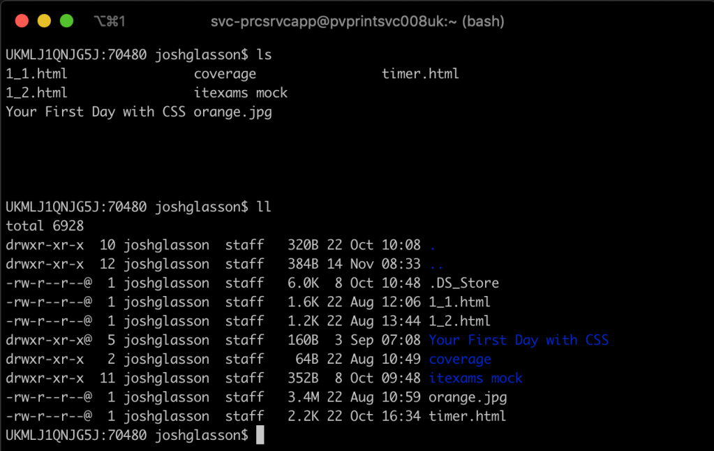 This works similarly to ls but gives you more information. Rather than just listing everything in the directory, it also shows you permissions, owner, size, and date last modified. It also highlights folders and shows hidden files.