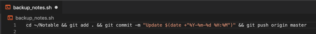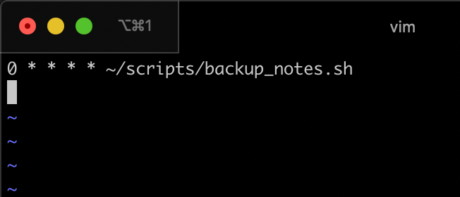 Cron jobs let you run scripts at set times or intervals. I set up a cron job to automatically sync my notes every hour. You can view and add to your cron jobs using crontab -e. This opens up the crontab file in your command line editor of choice. I added the timing and the script I wanted to run.
