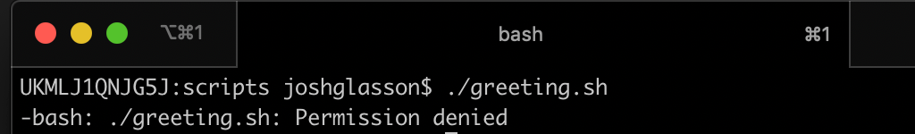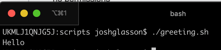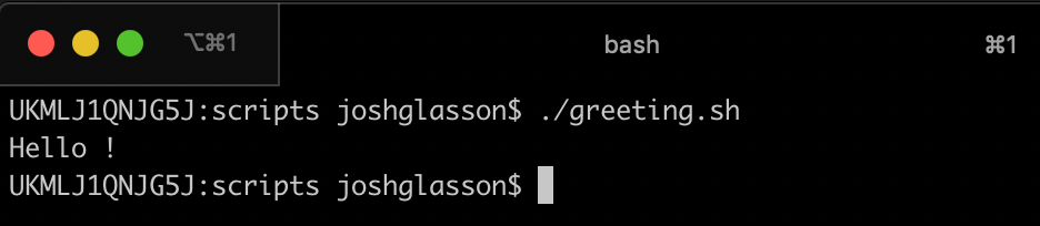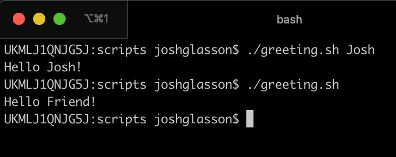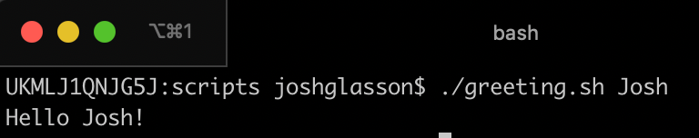 I now want to go a step further, I want to make it more personal. To do this I am going to pass a parameter through when I run the script. I want ./greeting.sh Josh to print out Hello Josh!