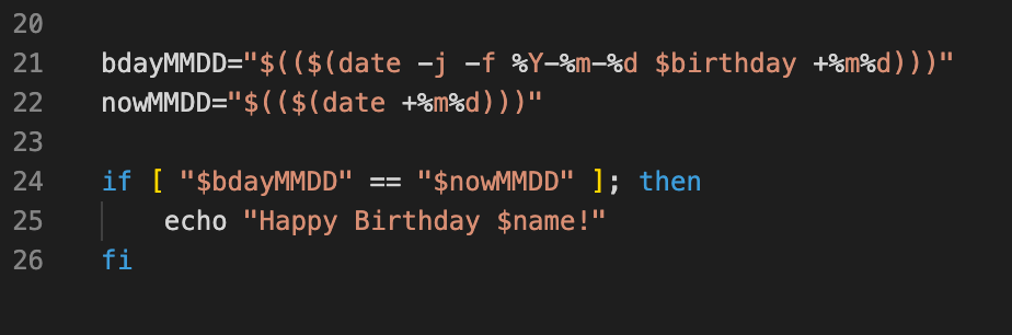set -e lets you set additional variables, like bday.$(( )) lets you performa actions like arithmetic inside.$(date -j -f %Y-%m-%d $birthday +%s) is telling the script that it needs to format the $birthday parameter from YYYY-MM-DD into epoch seconds.$(date +%s) is getting the time now in epoch seconds.timeUntil is taking one date from the other.$timeUntil/(24*3600)/365 is getting the epoch seconds and finding the difference in years.