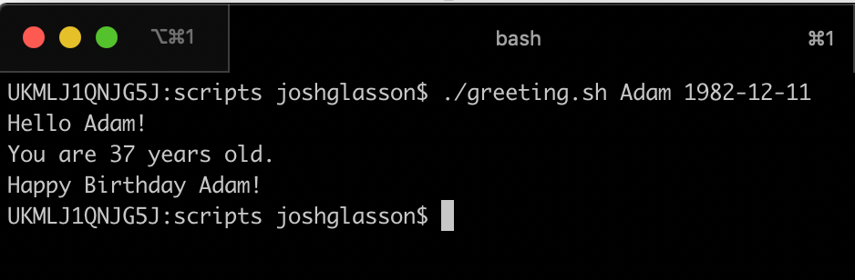 Awesome, now our script is personalised. But we can do a little better. Why not enter your birthday and have the script tell you how old you are!