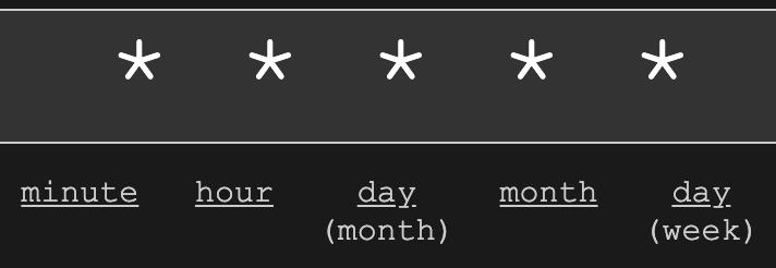 0 * * * * tells it that I want it to run on the 0th minute of every hour. Each star refers to a different time value.