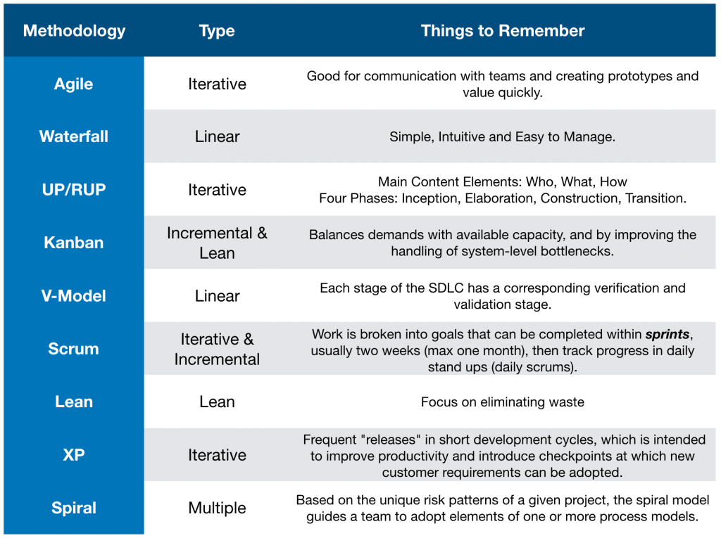 There are lots of different methods for software development, but the main two specified in the syllabus are Waterfall and Agile.