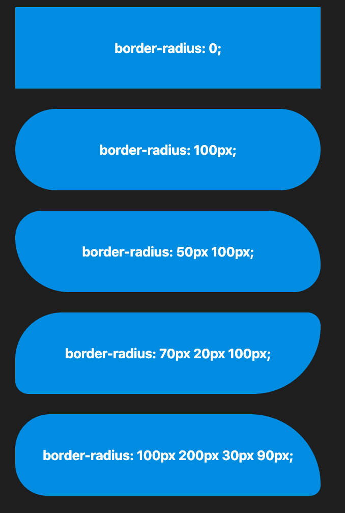 Syntaxborder-radius: 10px; – Radius set for all 4 cornersborder-radius: 10px 5px; – top-left and bottom-right | top-right and bottom-leftborder-radius: 2px 4px 2px; – top-left | top-right and bottom-left | bottom-rightborder-radius: 1px 0 3px 4px; – top-left | top-right | bottom-right | bottom-left