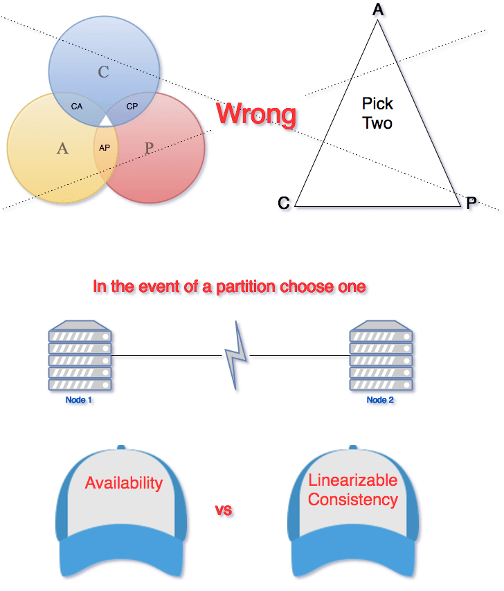 CA database: A CA database delivers consistency and availability across all nodes. It can’t do this if there is a partition between any two nodes in the system, however, and therefore can’t deliver fault tolerance.