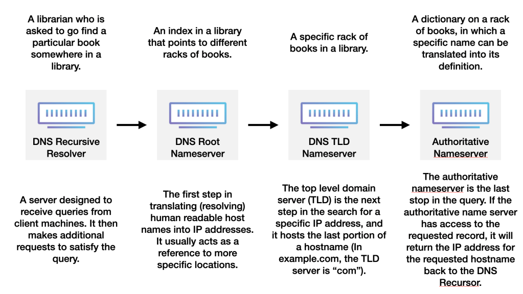 IP adresses are what computers use to communicate, acting a bit like a home adress for an internet device or server. DNS translates the IP adderss into a human readable domain name, so we don’t have to remember a seemingly random assortment of numbers and letters. Here is the flow between different DNS servers to resolve a hostname: