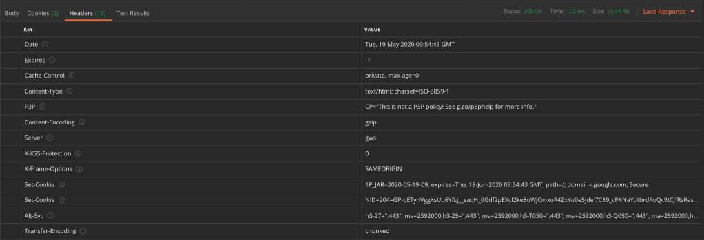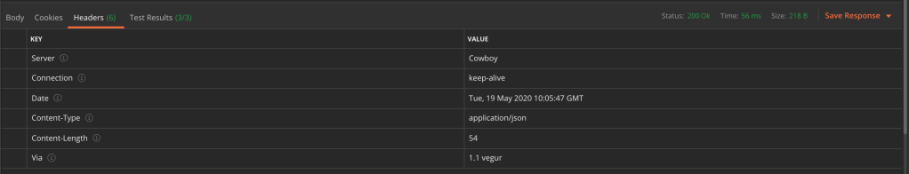 Next, we can look at the response. Firstly we can see the status code and response time: