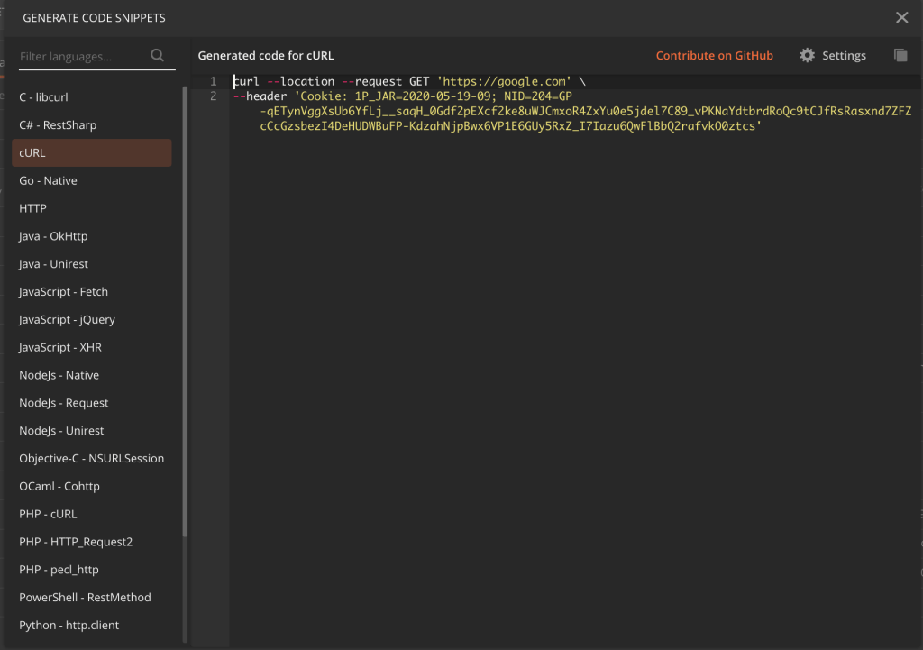 Clicking on the Code link will give you a bunch of code snippets which are the equivalent of the call Postman just made: