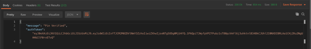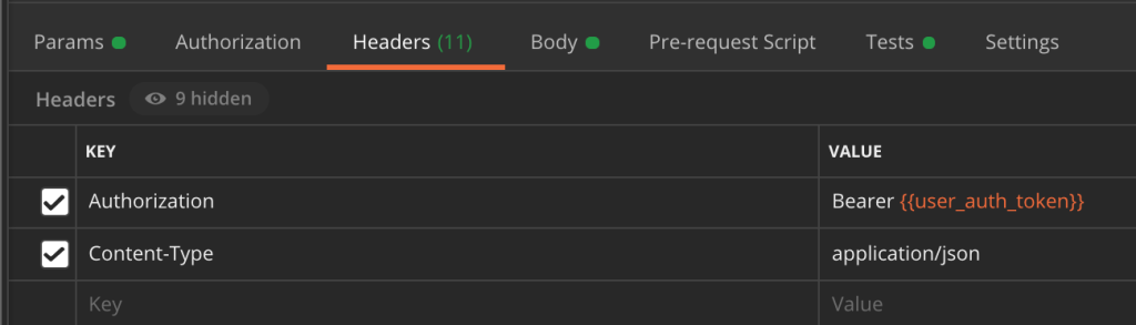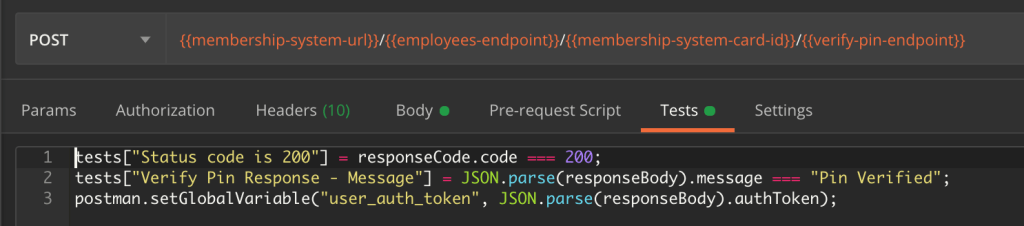 You can see in the above that the auth token is actually stored as a variable. This is not a constant, and is actually set using a test from another endpoint. I will go into more detail on that shortly.