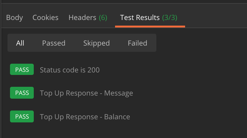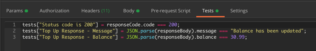 Finally for the request there is the Tests tab, which allows you to assert things on the response, and is also where we can set variables. Here is the test for the current call: